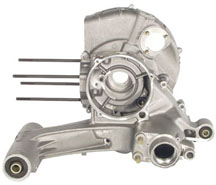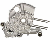 Large Frame OverviewThe large frame casing was retrofitted to be able to carry an electric start function similar to the small frame system. The difference is that the starter motor cannot stick out straight from the casing so it has a 90 degree gear and a recessed area of the flywheel casing t fit in between the motor and the rear shock. The only different parts that consititute the electric start system are the cases, the starter motor, and the flywheel. Everything else within the motor is the same as a non electric start motor. The cases: All new casings come with a starter area