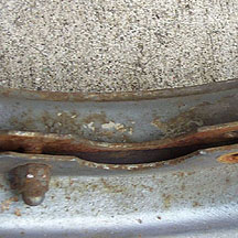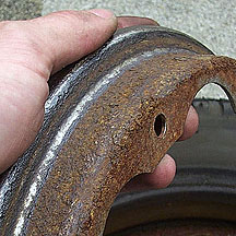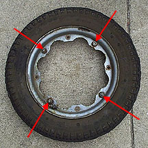 Next, remove the 4 13mm nuts that hold the two rim halves together as shown below with the red arrows below. The rim halves may or may not have a tight grip on the tire. If they do it is necessary to force the tire off the rim with a pair of screwdrivers. On this tire I also replaced the tube as the old one had been patched a few times and this is a good time to change it out as it costs under $10. Also, sometimes the inner face of the rim can be rusted and sharp flakes can puncture the new tube. I always scrape down the inside face of the rims to be sure that my new tube will survive.