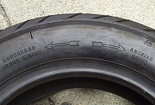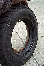 The tire I chose was a Continental Zippy-1 because eventually this bike will become a tuned TS1 engined bike and I would like to have a tire that can keep up with the performance of the bike. Cheaper tires are fine for standard machine and I have listed a bunch of tire manufacturers in the resource page. Some tires are directional and they must be installed to rotate in a certain way when installed on a scooter. On the Continental tire, it depends whether the tire is to be used on the rear or the front of the bike. There is a molded guide with arrows that must face in the direction of rotation. The easiest way to do this is to place it up against the bike in the way that it will be mounted. As far as I can tell this is more of an issue on a Vespa as the wheels are not reversible, but I believe a Lambretta's rims will go on correctly either way. See below for a close-up photo