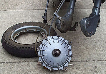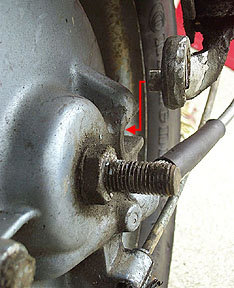 Once the wheel is pumped up (to about 18 PSI for the front) it can be refitted to the hub with the four nuts and lock washers. When the hub is refitted it is imperative that the stationary hub side is fitted correctly. On the right hand side fork link there is a large pin that must fit into a slot in the hub. This side of the hub must stay stationary in order for the brakes to function. See the photo below that shows the pin and the slot in the right hand side of the wheel hub.