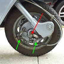 The first step is to remove the entire hub from the forks. There is a single 21mm on either side of the front axle that need to be loosened (arrowed below in red). The brake cable and speedometer cable do not need to be removed unless the hub is going to be worked on (arrowed in green). The forks pictured below are from an LI series Lambretta. The SX200, TV175, TV200 and GP200 will differ because of small damper mounted from the fork link to the forks on both sides. These will not need to be removed in order to change the tire.