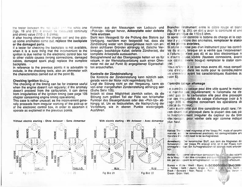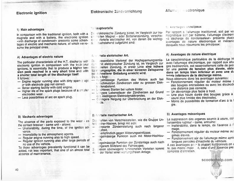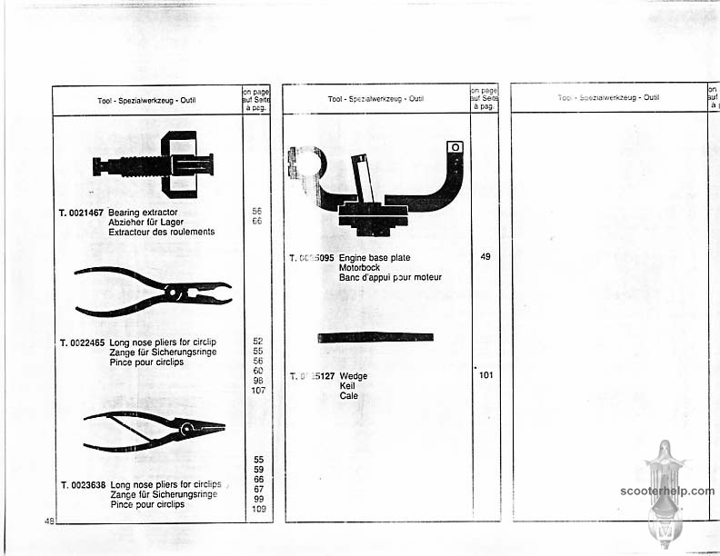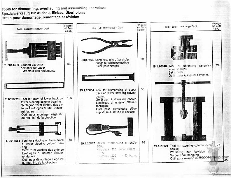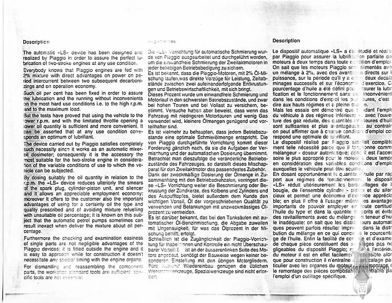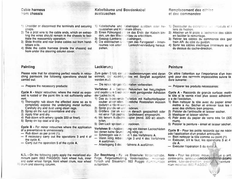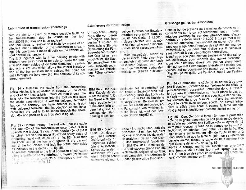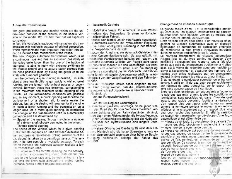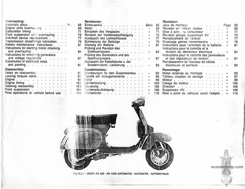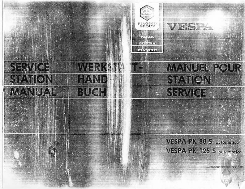 Vespa PK80S Automatica & PK125S Automatica Factory Repair BookThese scans are taken from the original service book which was distributed to dealers in the 80s. It shows some maintenance information, a quick guide to disassembly, and various pages of tolerances and electrical diagrams. It also give loads of electrical information and testing options for the ignition system, and shows many cool factory tools that were available to repair shops. Click each thumbnail for a 150 dpi image. If you prefer a PDF file of all the pages click here for a 13.2MB file download. |