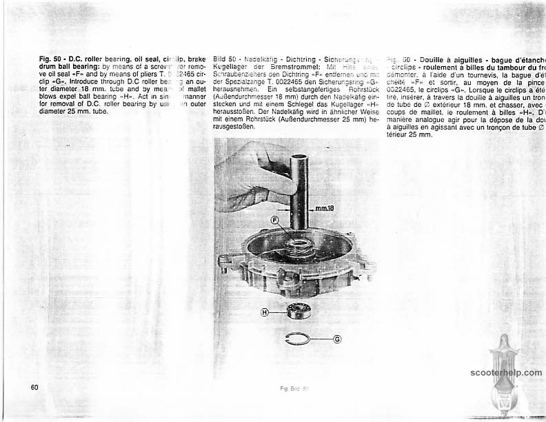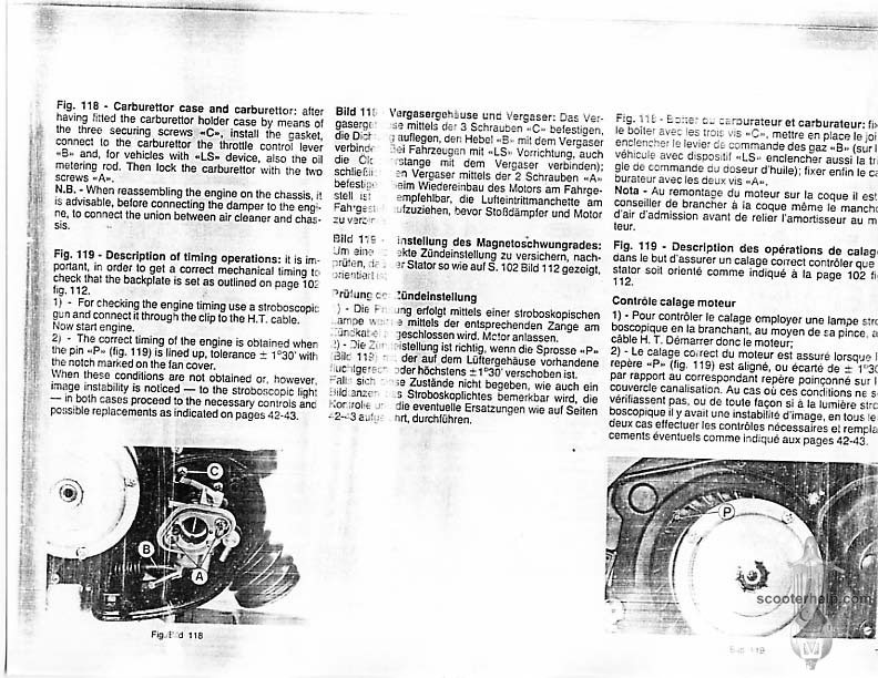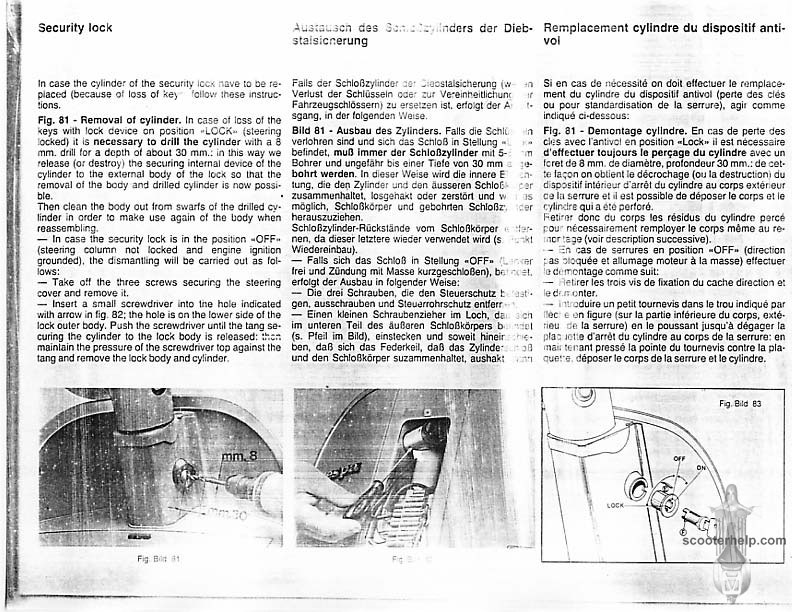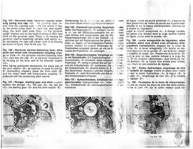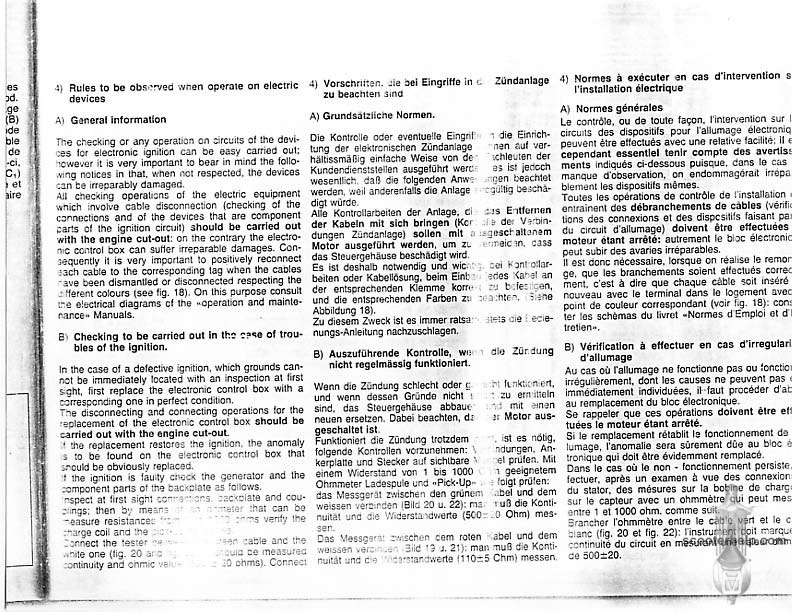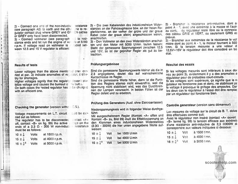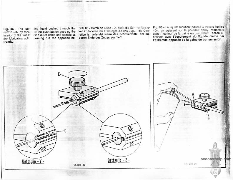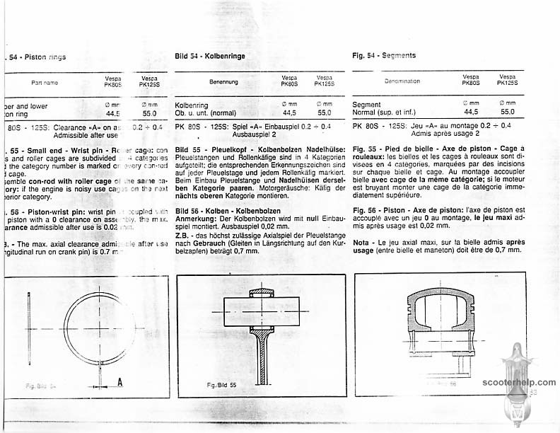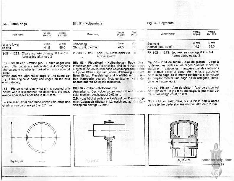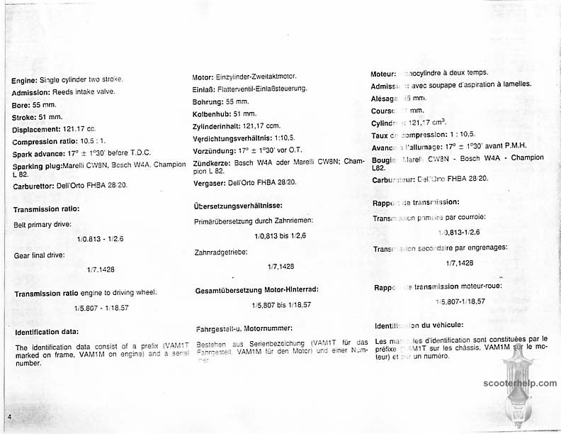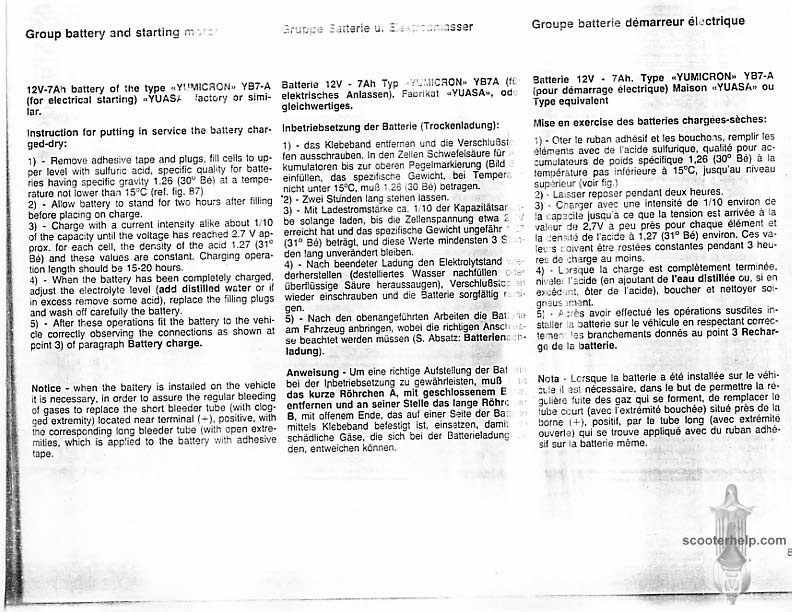 Vespa PK80S Automatica & PK125S Automatica Factory Repair BookThese scans are taken from the original service book which was distributed to dealers in the 80s. It shows some maintenance information, a quick guide to disassembly, and various pages of tolerances and electrical diagrams. It also give loads of electrical information and testing options for the ignition system, and shows many cool factory tools that were available to repair shops. Click each thumbnail for a 150 dpi image. If you prefer a PDF file of all the pages click here for a 13.2MB file download. |