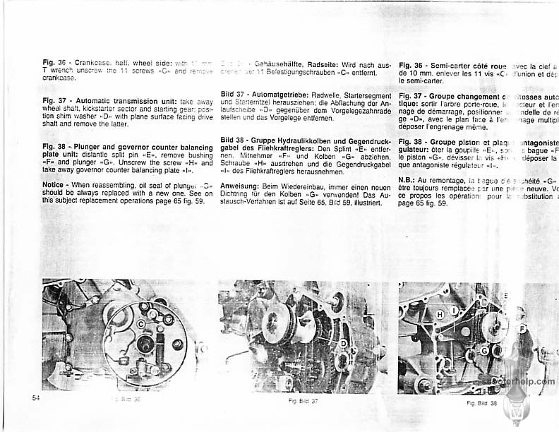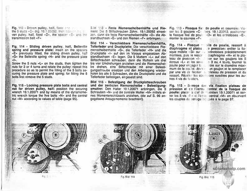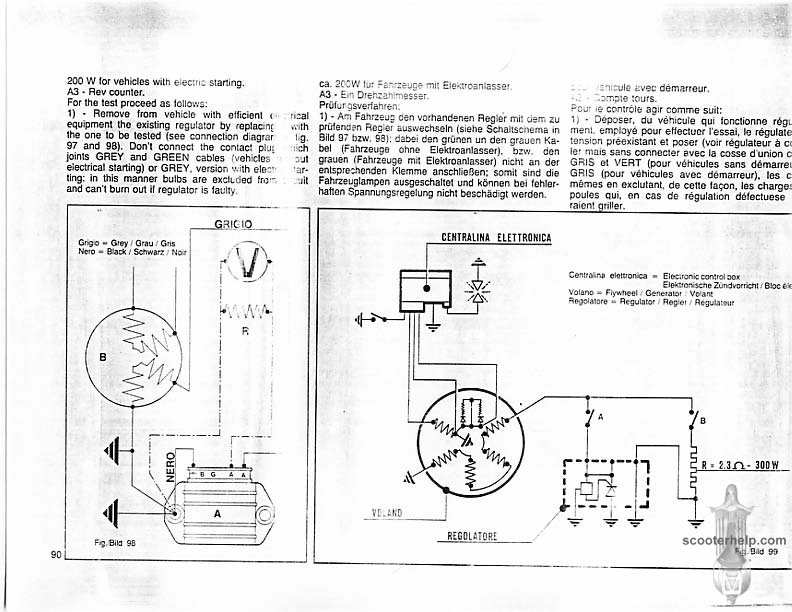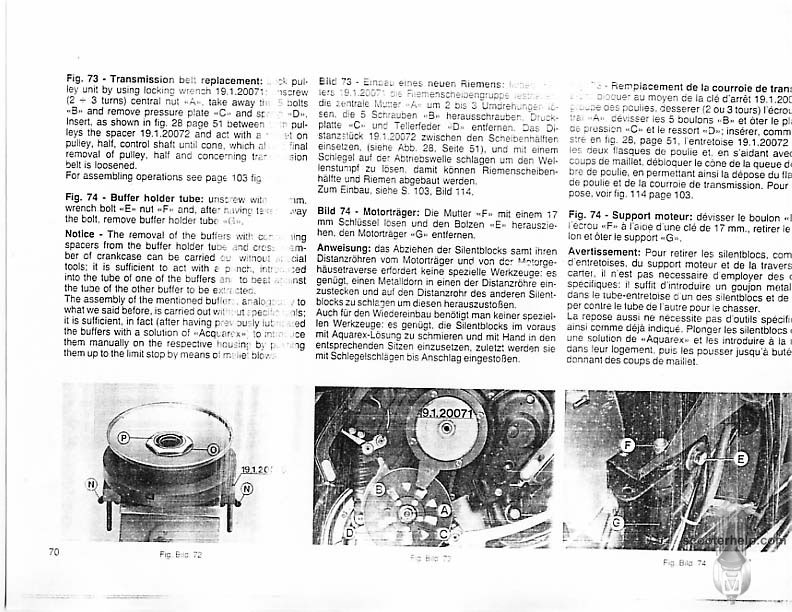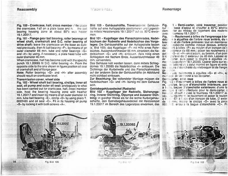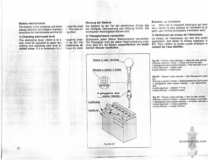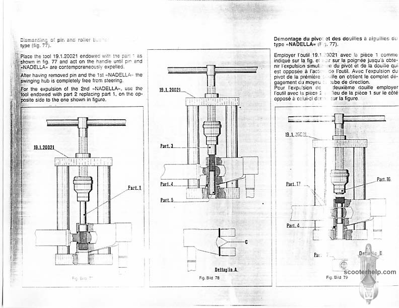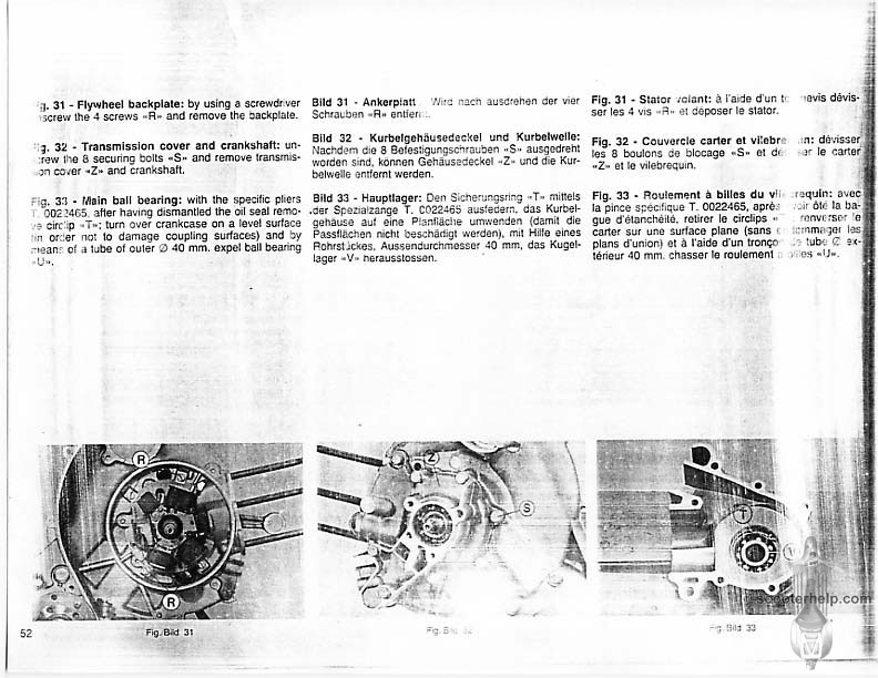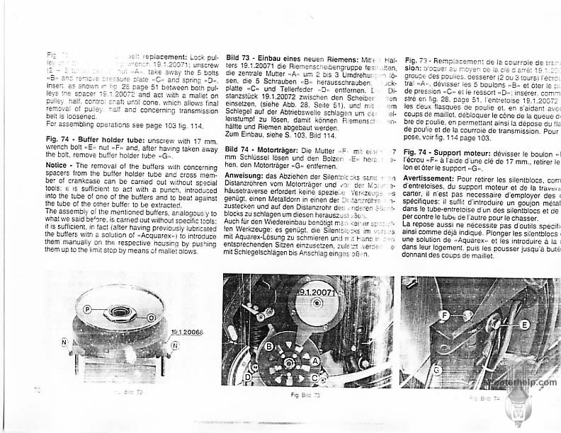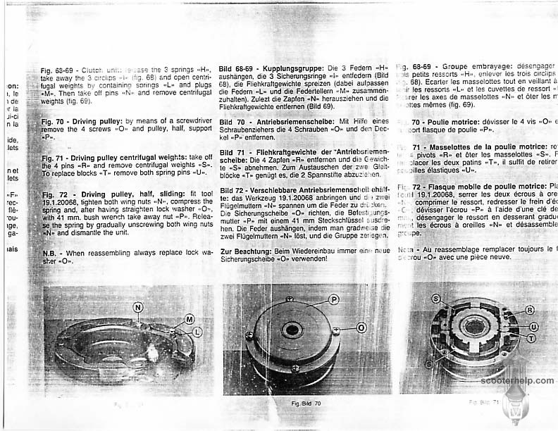 Vespa PK80S Automatica & PK125S Automatica Factory Repair BookThese scans are taken from the original service book which was distributed to dealers in the 80s. It shows some maintenance information, a quick guide to disassembly, and various pages of tolerances and electrical diagrams. It also give loads of electrical information and testing options for the ignition system, and shows many cool factory tools that were available to repair shops. Click each thumbnail for a 150 dpi image. If you prefer a PDF file of all the pages click here for a 13.2MB file download. |
