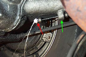 (7) Removing the main pivot bolt and rear shock bolt. The last two items that hold the engine in place are the rear shock connection and the main pivot bolt which passes through the swingarm and the frame. The shock bolt is usually the best to remove first (see below). Use a 14mm driver on the open side (red arrow), and a 14mm wrench on the hidden nut on the back side (green arrow). If you don't stop the back side from rotating the entire bolt will rotate rather than coming loose. Once removed, used a pair of vice-grips to pull it free. The engine should drop slightly until the rear wheel hits the ground.