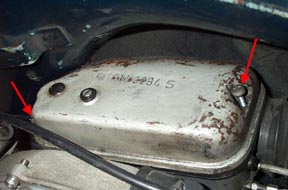 (4) Disconnect the fuel line (& oil line on some models): Turn your fuel valve to off. On all vespas this should be the far left position. Locate the carb box and remove the two screws on the cover as shown below.