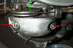 (5) Disconnect the gear selector: The gear selector can come off in one piece with the gear cables still connected. You ma or may not need to remove the kickstart because on some models the kickstart bolt will hit the gear cable adjuster and stop the selector coming completely off. Start be removing the selector box cover which is retained by a single screw at the base of the fan cover (green arrow below). Then remove the two 11mm nuts that hold the selector on (see red arrows below).
