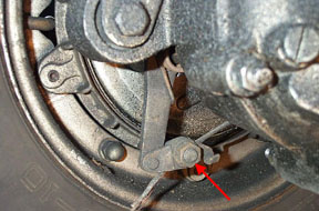 Unhook the choke cable and push it back through the carb box hole. Use the frame bellow hole again to keep it clear of the engine. The throttle cable has a a soldered nipple which has to be dislodged from the carb slide/oil pump end. Use headset throttle to open up the throttle, and then catch it with a screwdriver at a half open point and remove the throttle cable from the slide end. Push this back through the carb box and bend it up into the frame bellow opening. The rear brake arm is located just below the rear shock mount and has a single 13mm bolt with a hole through the center which holds the brake cable in place by compression. Loosen the nut on the outside face of the brake arm and the cable should pull through (see below). Once free, pull the cable out of the casing mounted cable adjuster and clear of the engine.