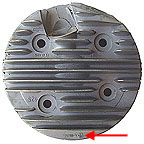Lambretta Li125 Special head - a more central combustion chamber than an standard Li125. Shared w/GP125 motor. Part number A-10504 is stamped on the bottom face (arrowed).
