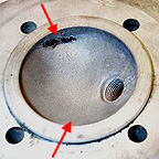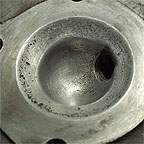 Vespa VBA head - a very domed chamber with small indentations (arrowed) to allow for the clearance with the deflector type piston. A small lip is also present.